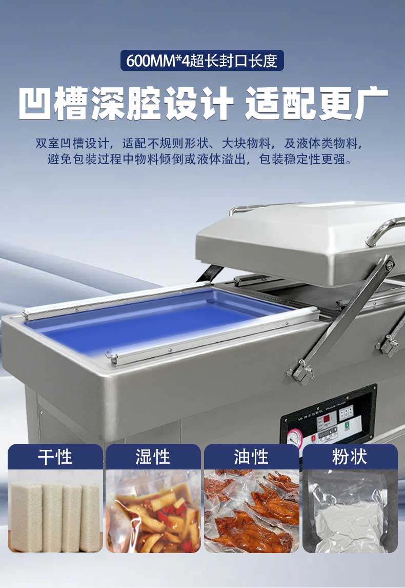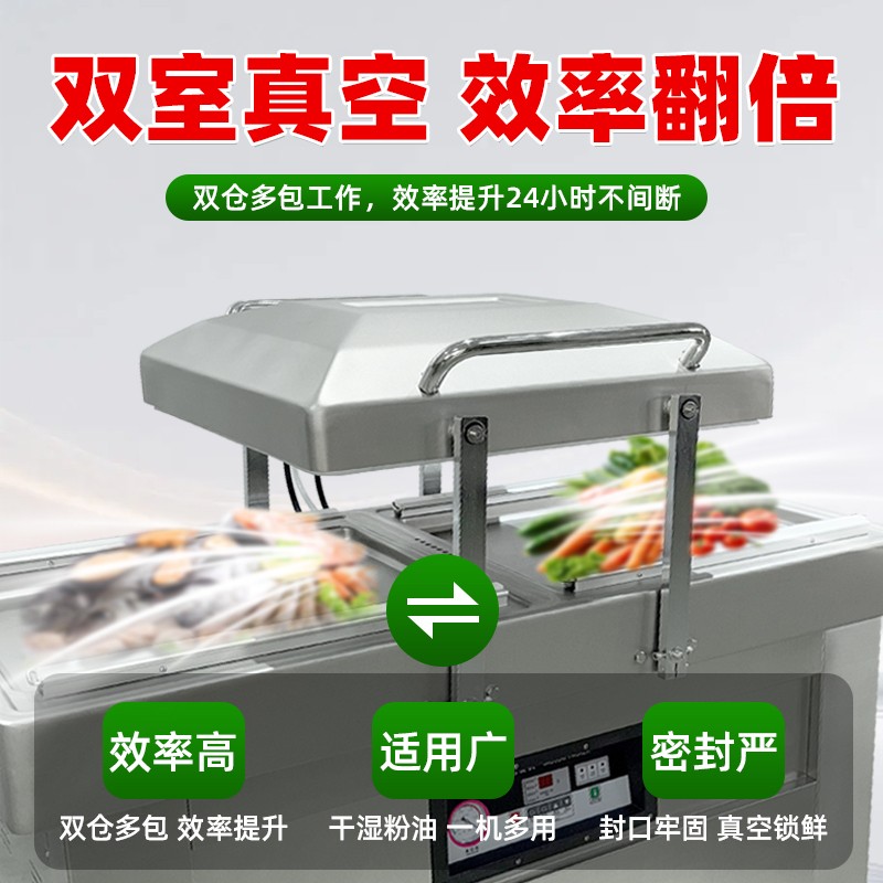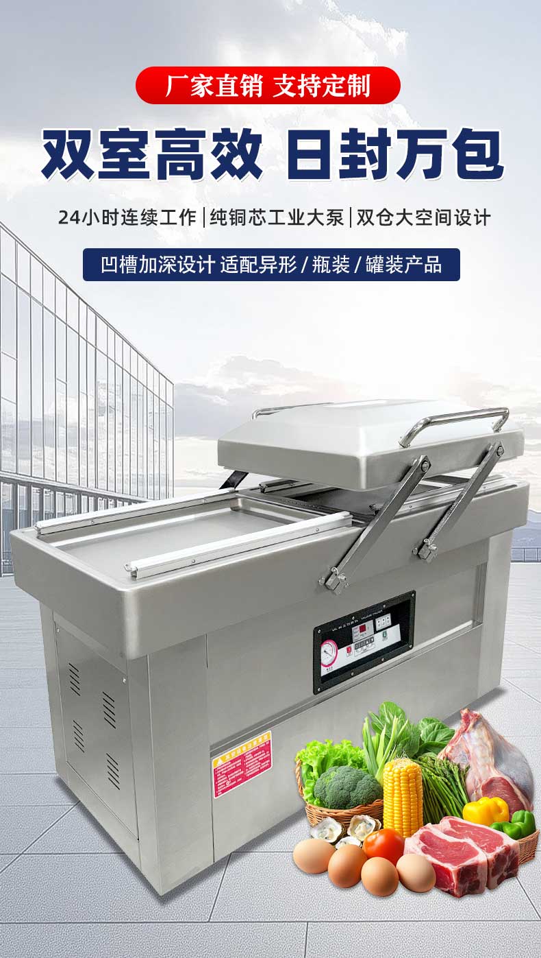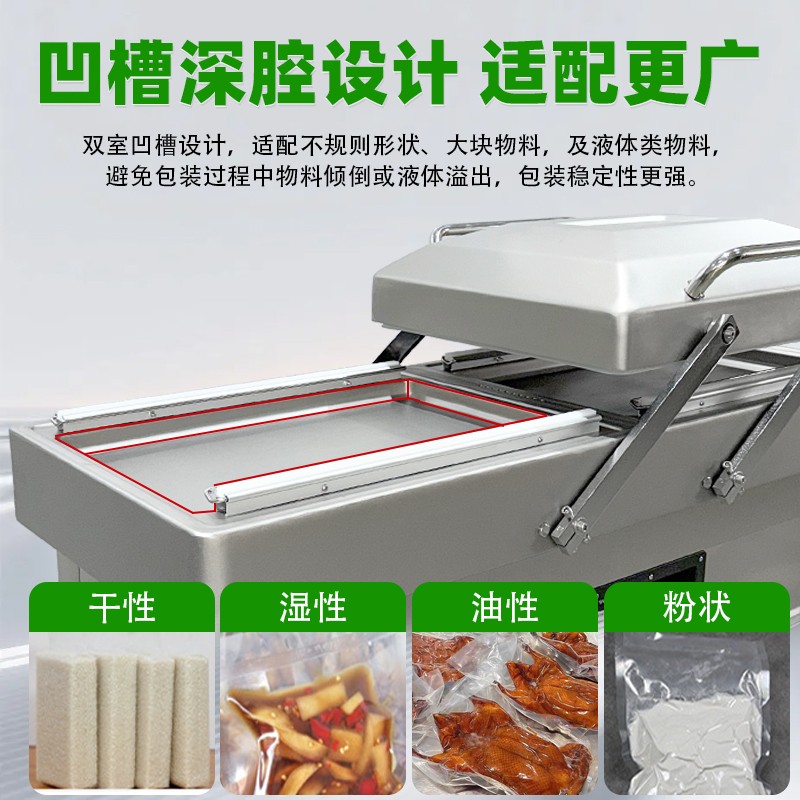 在卤味飘香的熟食店、水产丰富的渔港作坊、预制菜量产的食品工厂中,带汤汁、高水分产品的包装始终是行业痛点——传统真空机易漏液、效率低、保鲜差的问题,往往导致食材损耗、客诉频发。双室凹槽真空机专为这类产品量身打造,以“防漏锁鲜+高效量产”为核心,通过结构创新与技术升级,成为卤味、水产、预制菜行业的包装利器。针对卤味卤汁、水产冰衣、预制菜汤汁等特殊属性,设备在真空系统、密封结构、操作逻辑上实现全维度优化,从源头规避包装风险。