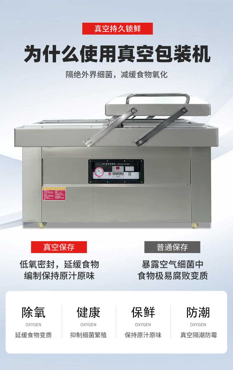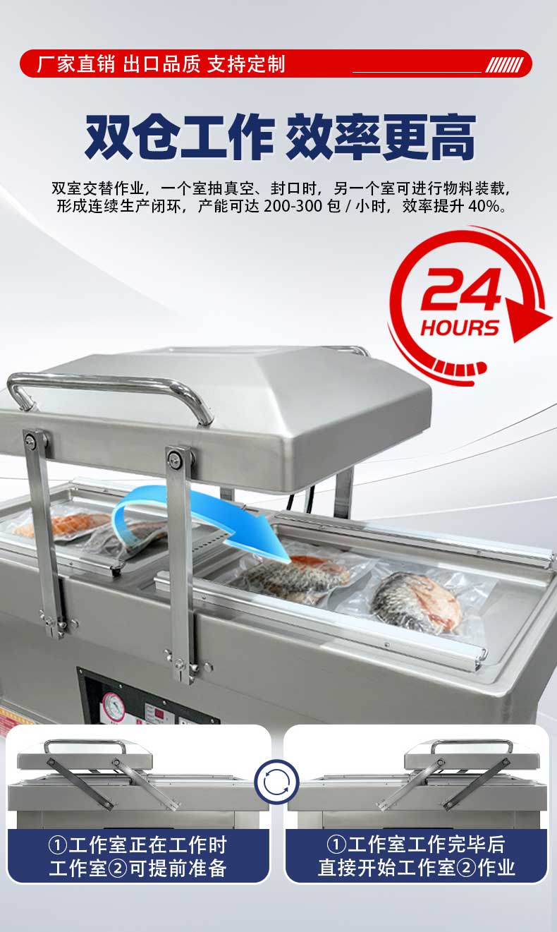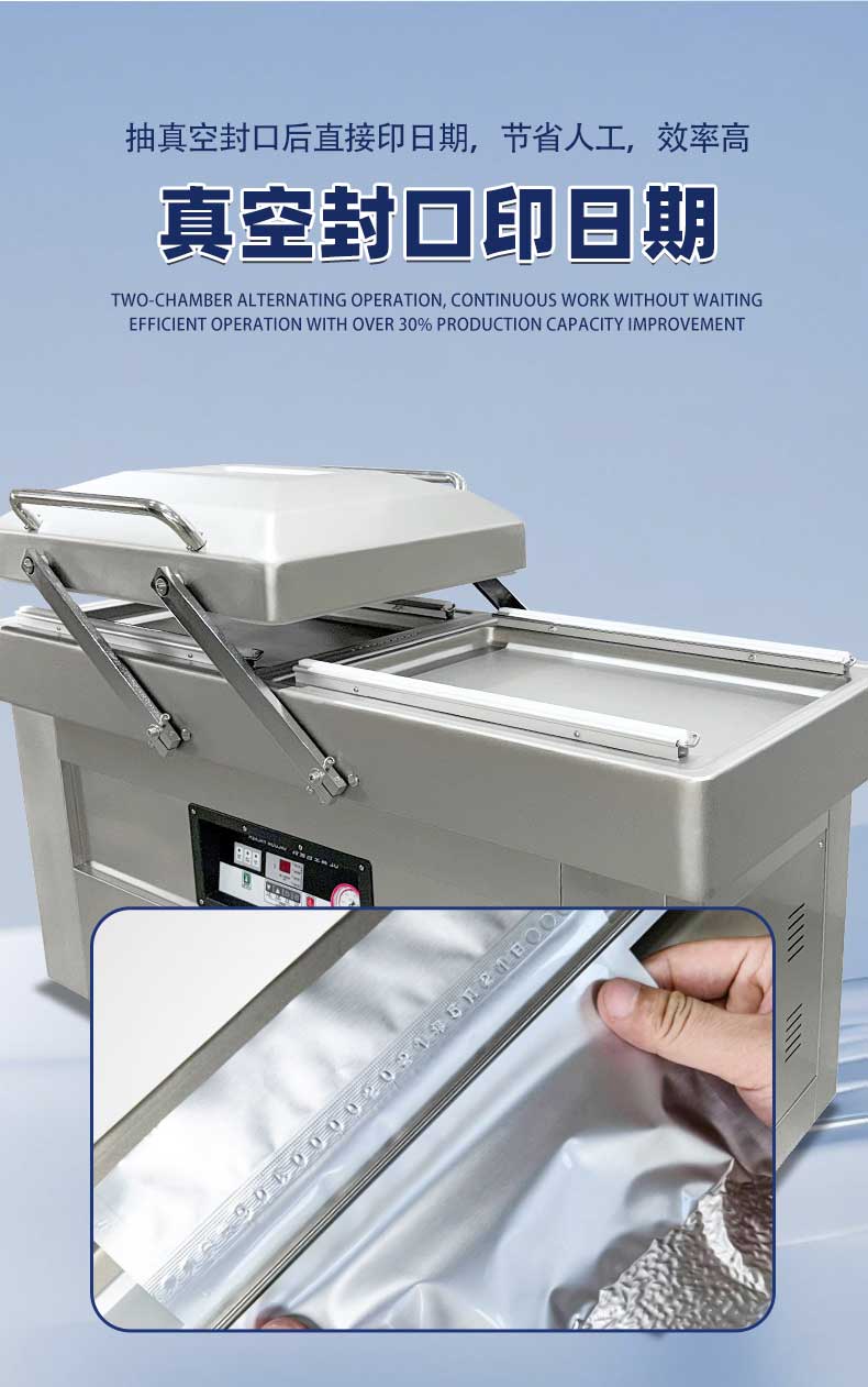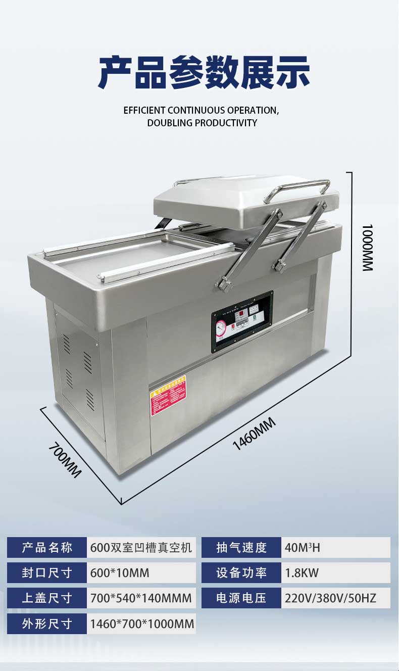 在卤味飘香的熟食店、水产丰富的渔港作坊、预制菜量产的食品工厂中,带汤汁、高水分产品的包装始终是行业痛点——传统真空机易漏液、效率低、保鲜差的问题,往往导致食材损耗、客诉频发。双室凹槽真空机专为这类产品量身打造,以“防漏锁鲜+高效量产”为核心,通过结构创新与技术升级,成为卤味、水产、预制菜行业的包装利器。针对卤味卤汁、水产冰衣、预制菜汤汁等特殊属性,设备在真空系统、密封结构、操作逻辑上实现全维度优化,从源头规避包装风险。