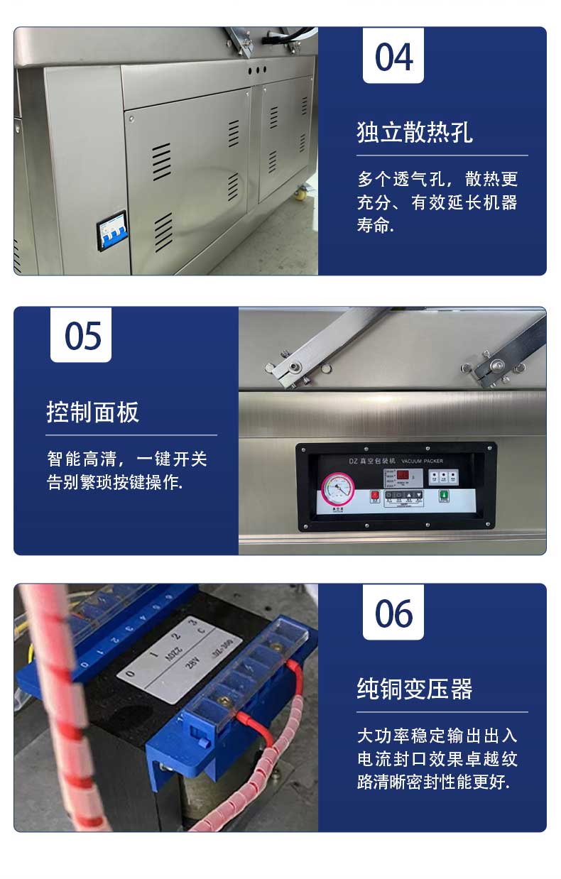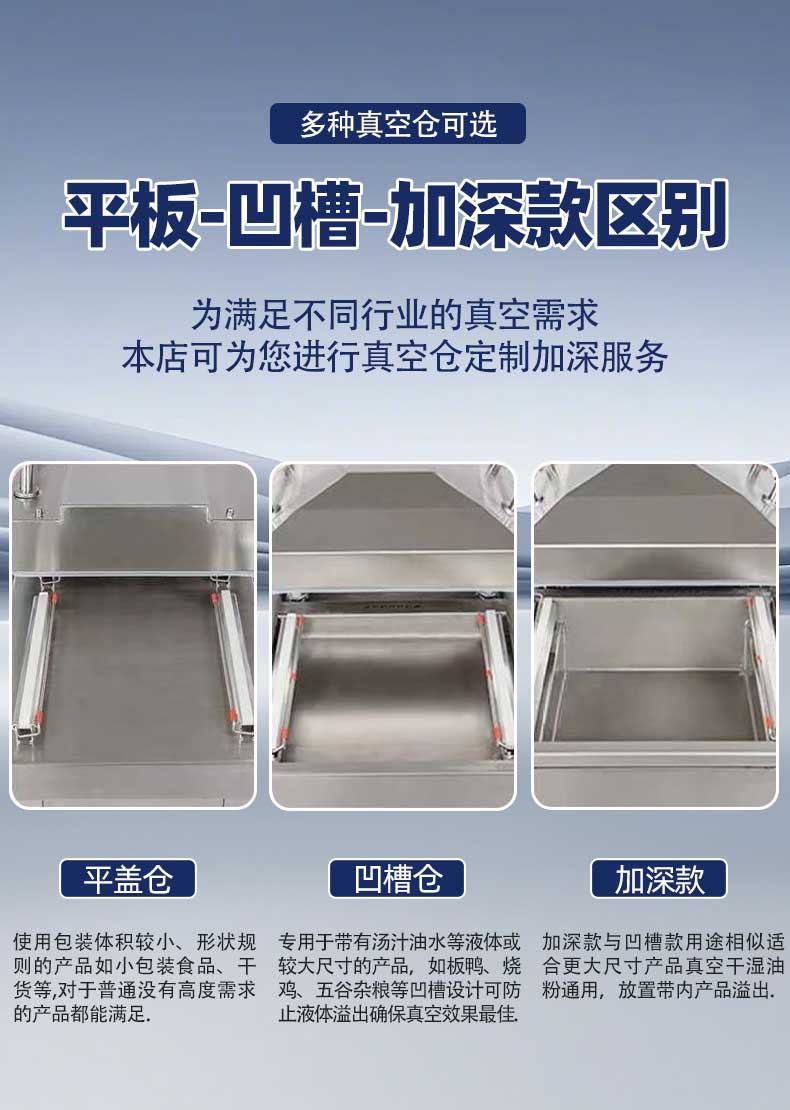 设备核心创新在于真空室的凹槽式设计,真空室内腔下凹深度可达10-40厘米(支持定制),卤味拼盘、整只带汤烧鸡、大份预制菜等产品可垂直或倾斜放置,袋内汤汁自然汇聚于凹槽底部,与封口线形成安全距离。配合“液体防吸智能程序”,设备采用“先微压排气再深度抽真空”的梯度模式,缓慢排出袋内空气的同时避免汤汁飞溅,解决了传统设备抽真空时“喷液进泵”的维修难题。