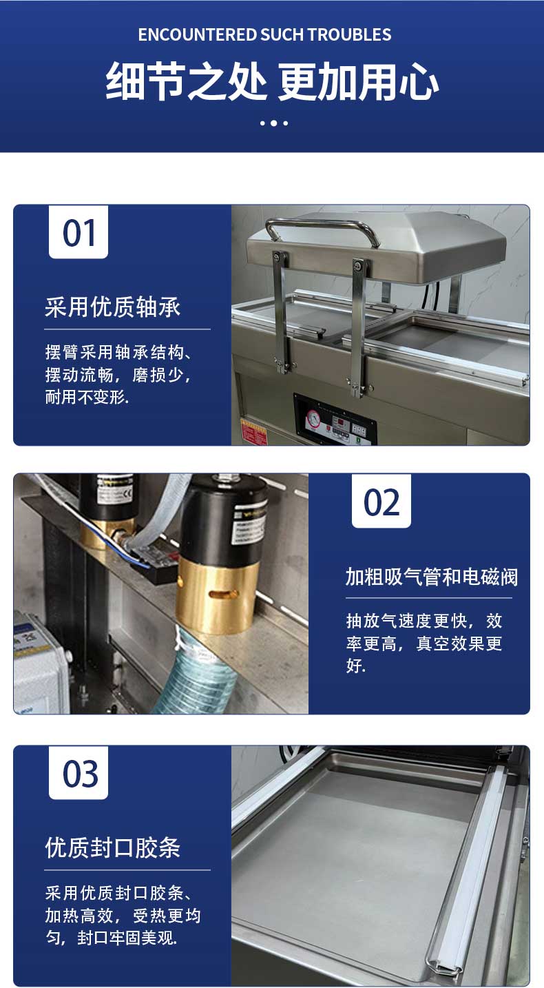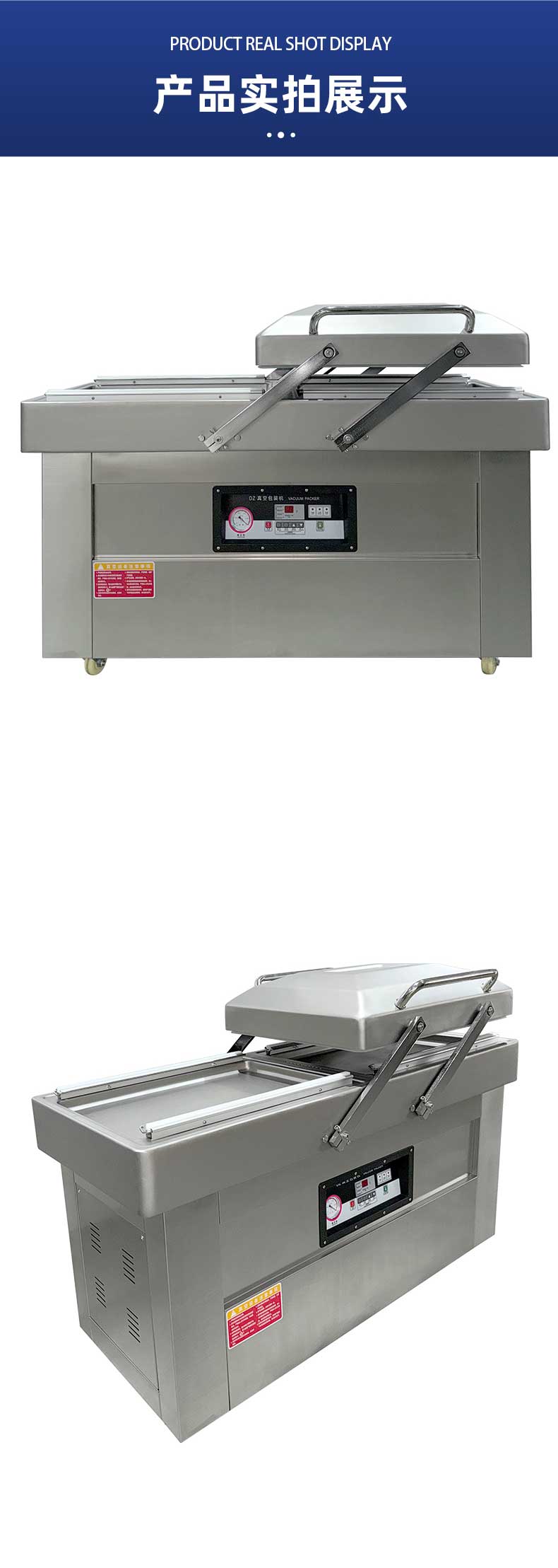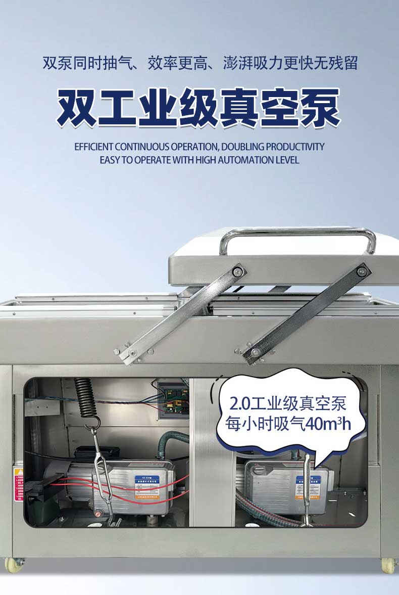 双室结构是设备的效率核心——两个真空室通过微电脑程序控制实现交替运作,当左侧真空室完成抽气、封口、冷却的全流程时,右侧真空室已完成物料摆放待命,真正实现“不停机连续工作”。搭配上海知名品牌大功率真空泵,双泵独立运作抽气速率可达2×20m³/h,单室机每小时最多包装160次。
