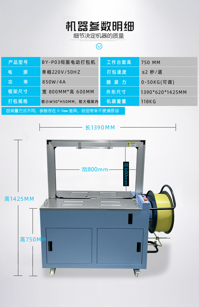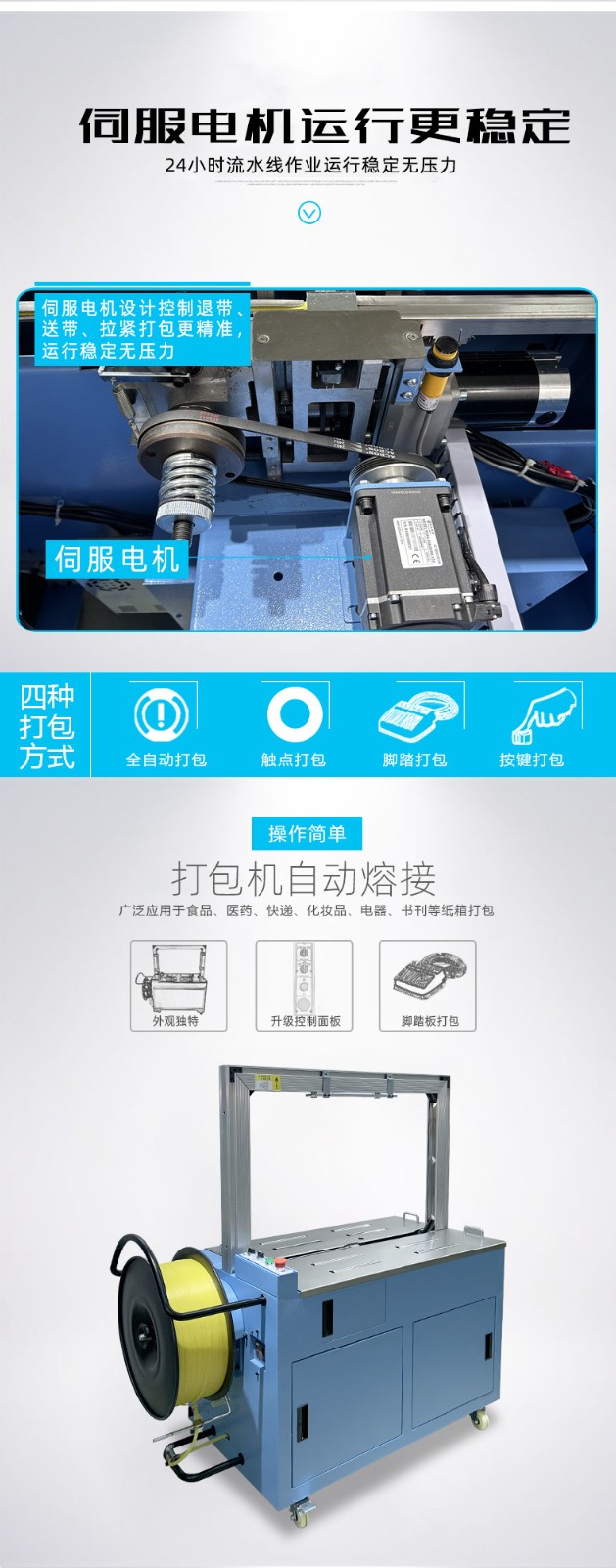 全自动伺服打包机是一种基于伺服控制系统的自动化包装设备,主要用于对产品进行捆扎包装,以便于运输和储存。