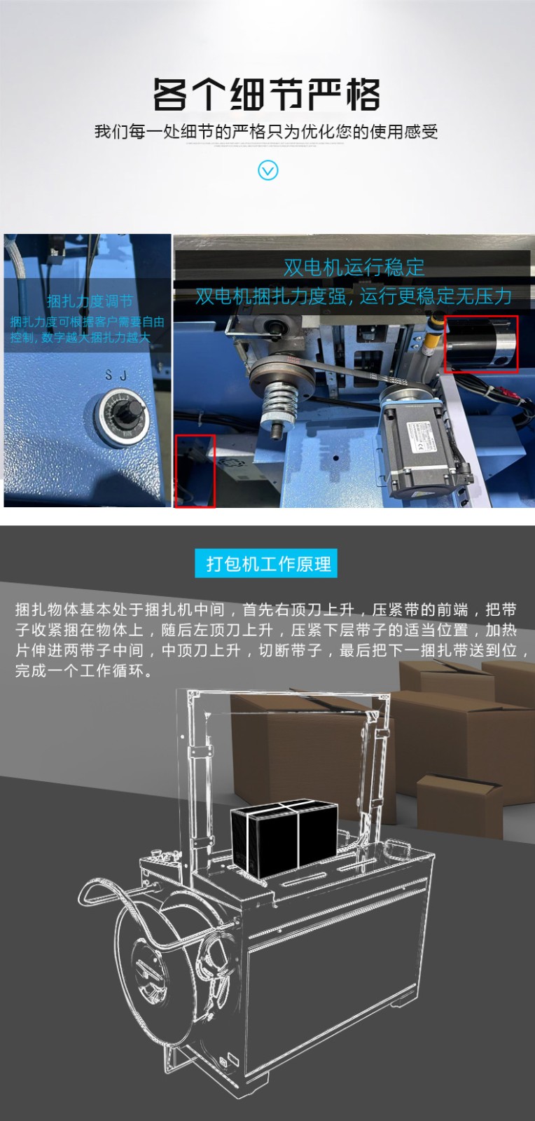 搭载高性能伺服电机驱动系统,设备运行过程中动力输出平稳无顿挫,启停响应速度快且动作衔接精准流畅,从送带、收紧、熔接到切带复位的每一个包装环节,都能按照预设参数精准执行。相较于传统异步电机,伺服电机可通过实时闭环控制,精准调节运行速度与扭矩,在捆扎收紧阶段,能根据货物规格自动适配张力大小,避免因张力过大导致包装带断裂、货物变形,或张力不足造成的捆扎松散问题,有效降低包装过程中的位置误差、力度误差与时间误差。同时,伺服系统的高重复性定位精度,可保证每一件产品的包装效果高度统一,无论是包装带的位置偏移量,还是熔接处的平整程度,都能控制在极小的误差范围内,让成品包装外观整齐划一,大幅提升产品包装的整体一致性与视觉美观度。广泛应用于,食品行业、医药行业、化工行业、其他行业等