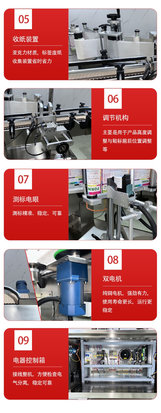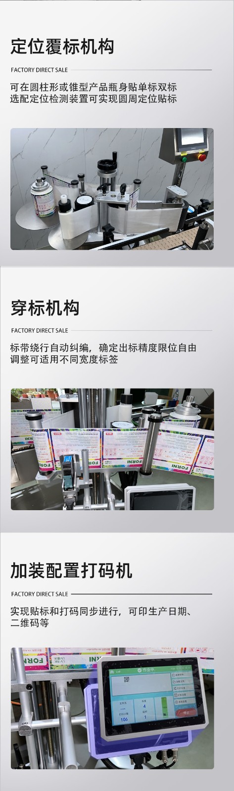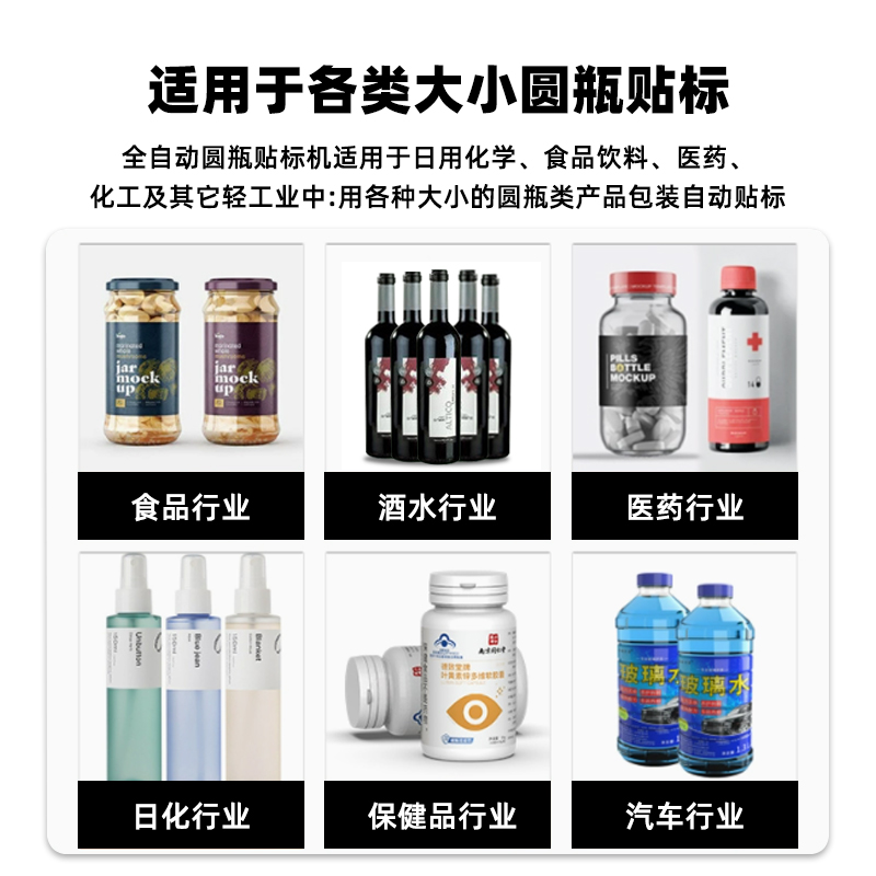 圆瓶类产品的贴标,可贴单标和双标,正背双标间距可灵活调整,部分机型还具备锥形瓶贴标功能。精准定位、高效智能、灵活兼容与合规耐用,可显著提升产线自动化与贴标良率。