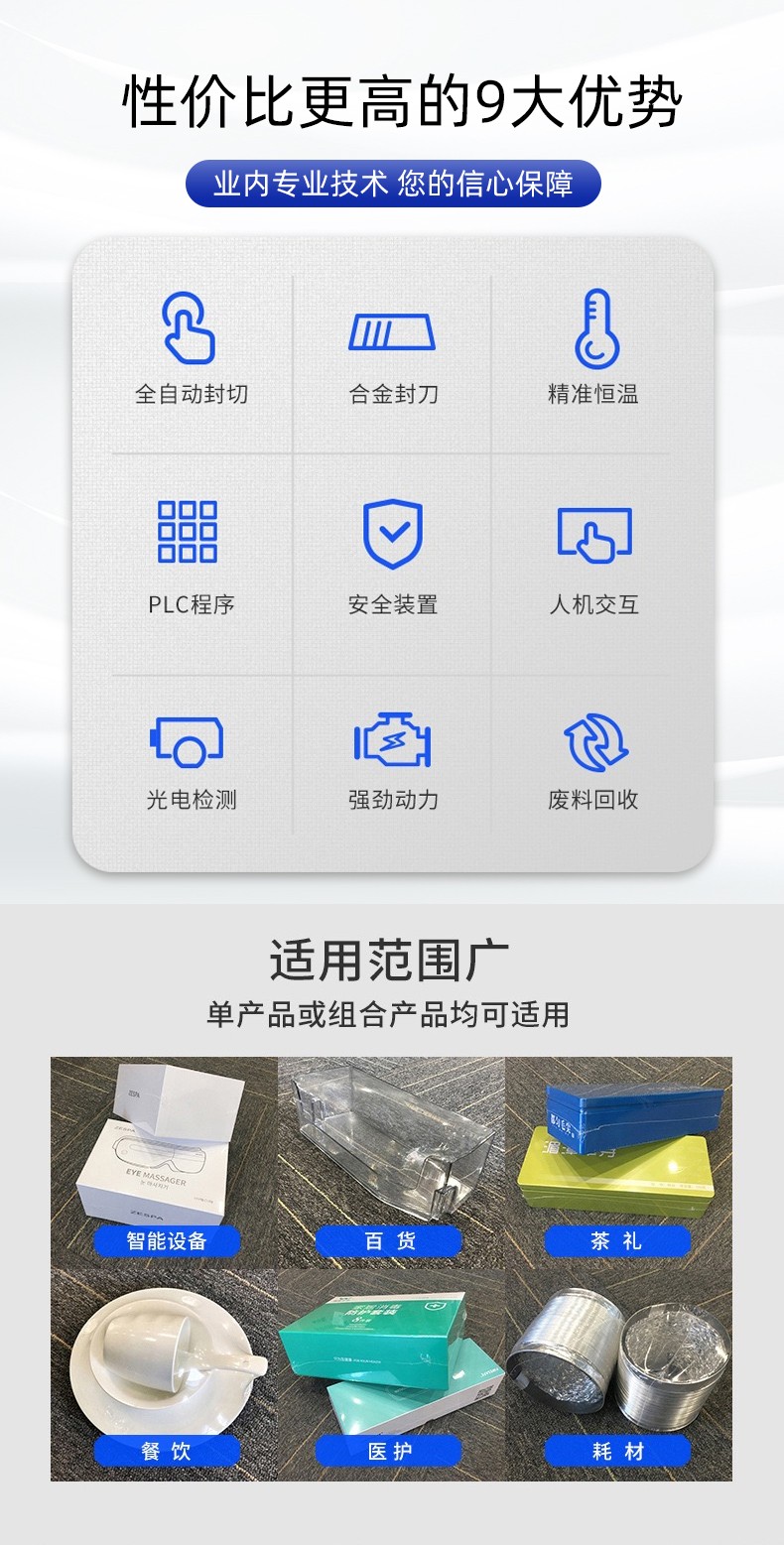 - 产品尺寸不超限:不包装超过设备最大长、宽、高的产品,避免输送卡滞、封切刀碰撞损坏;异形产品需加装定位工装,防止输送偏移引发封切错位。