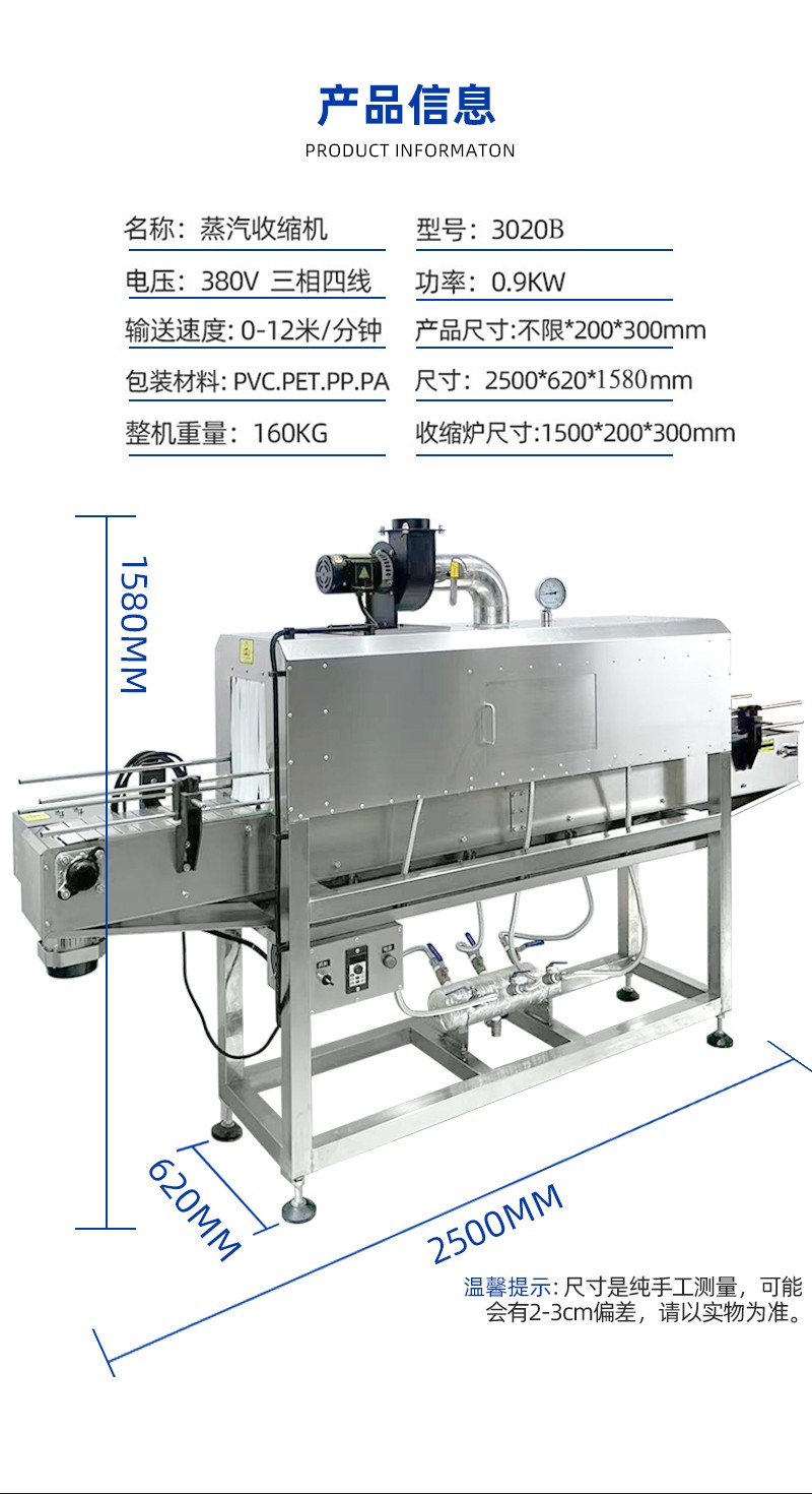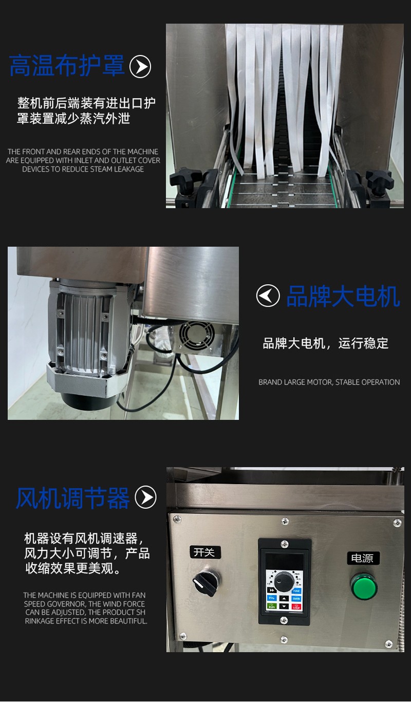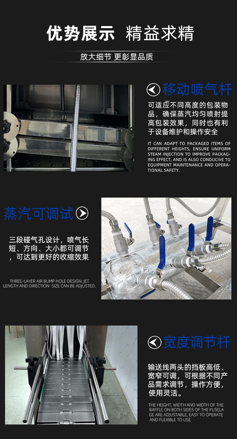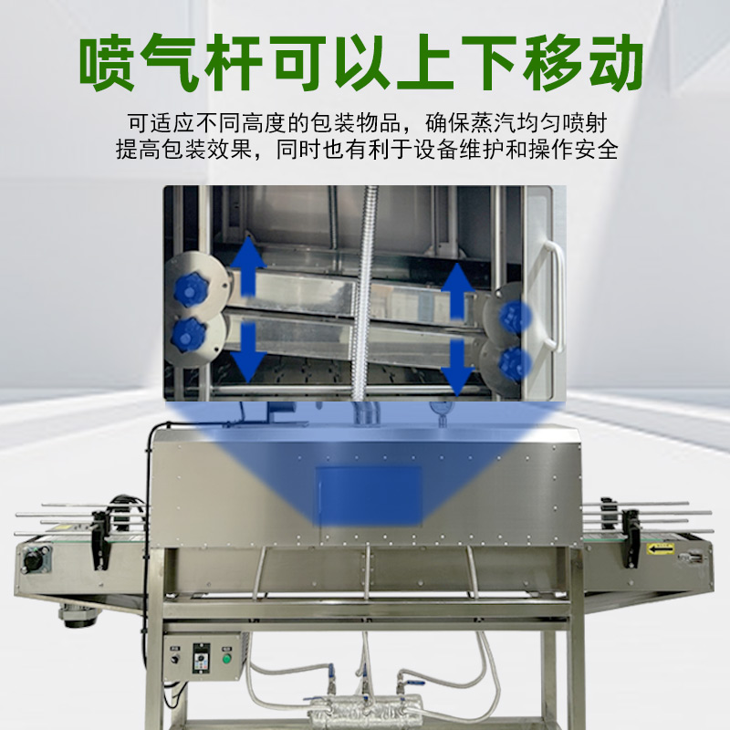 - 收缩通道:内部设有蒸汽喷射孔或喷嘴,通道长度与宽度根据产品尺寸可调,以确保蒸汽均匀覆盖。