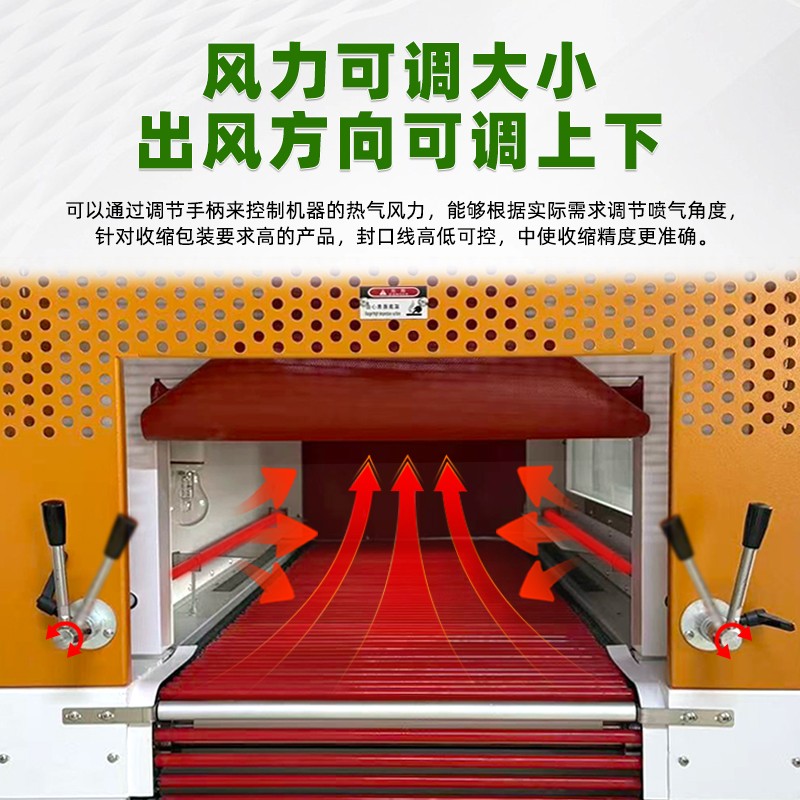- 热风分布均匀,适配不同规格产品的无死角收缩普通热收缩机的风机为定速运行,风量和气流方向固定,炉内容易形成局部气流死角:面对大件、异形或整箱堆叠的产品时,靠近风口的部位收缩过度,远离风口的部位收缩不足,导致包装成品凹凸不平;面对小件零散产品时,还可能出现薄膜被气流吹偏移的问题。双变频系统中,风机转速与加热功率联动可调,再配合炉腔内的多向导流风道设计,能形成上下左右立体循环热风。在高速生产时,变频提升风机转速,增强气流穿透力,确保大件产品内部和边角都能均匀受热;在小批量生产时,降低风机转速,避免小件产品薄膜偏移。无论是单个零件、整箱饮料还是异形五金件,都能实现无死角均匀收缩。
