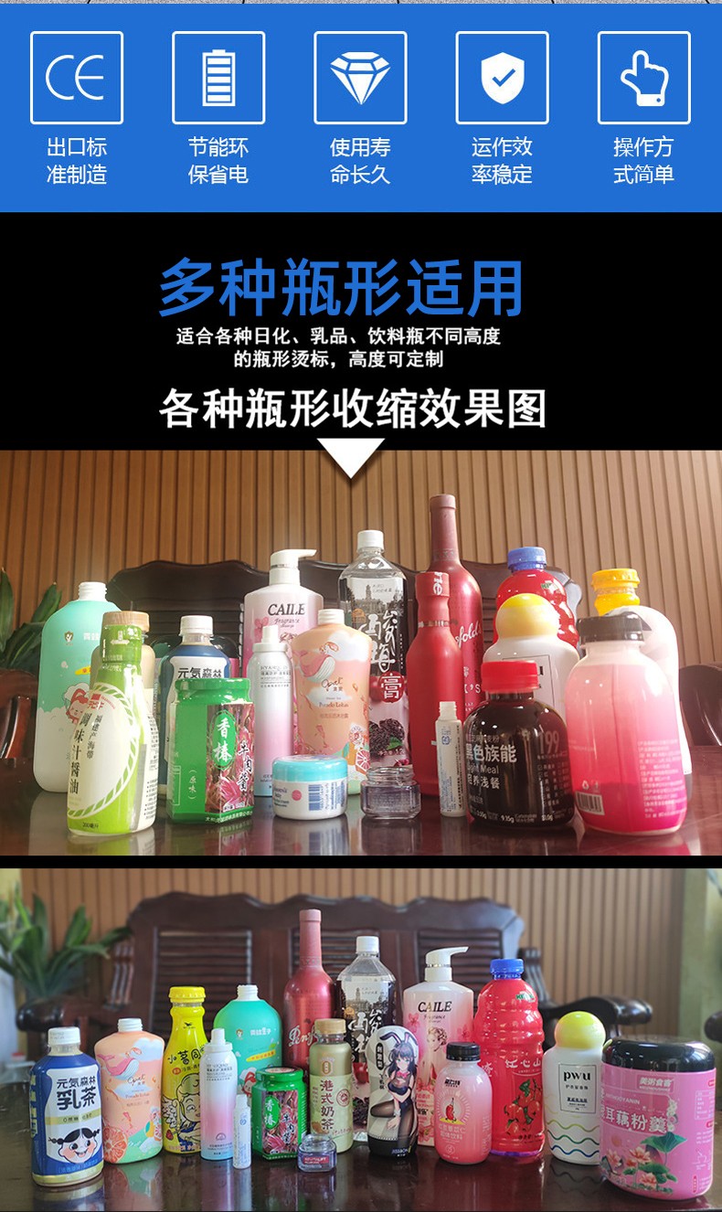 - 适用范围广:适用于各种形状和尺寸的容器,如玻璃瓶、塑料瓶、纸杯等,以及多种材质的标签膜或收缩膜,如 PVC、PET 等。广泛应用于食品饮料、化妆品、电子产品、五金工具等多个行业14。