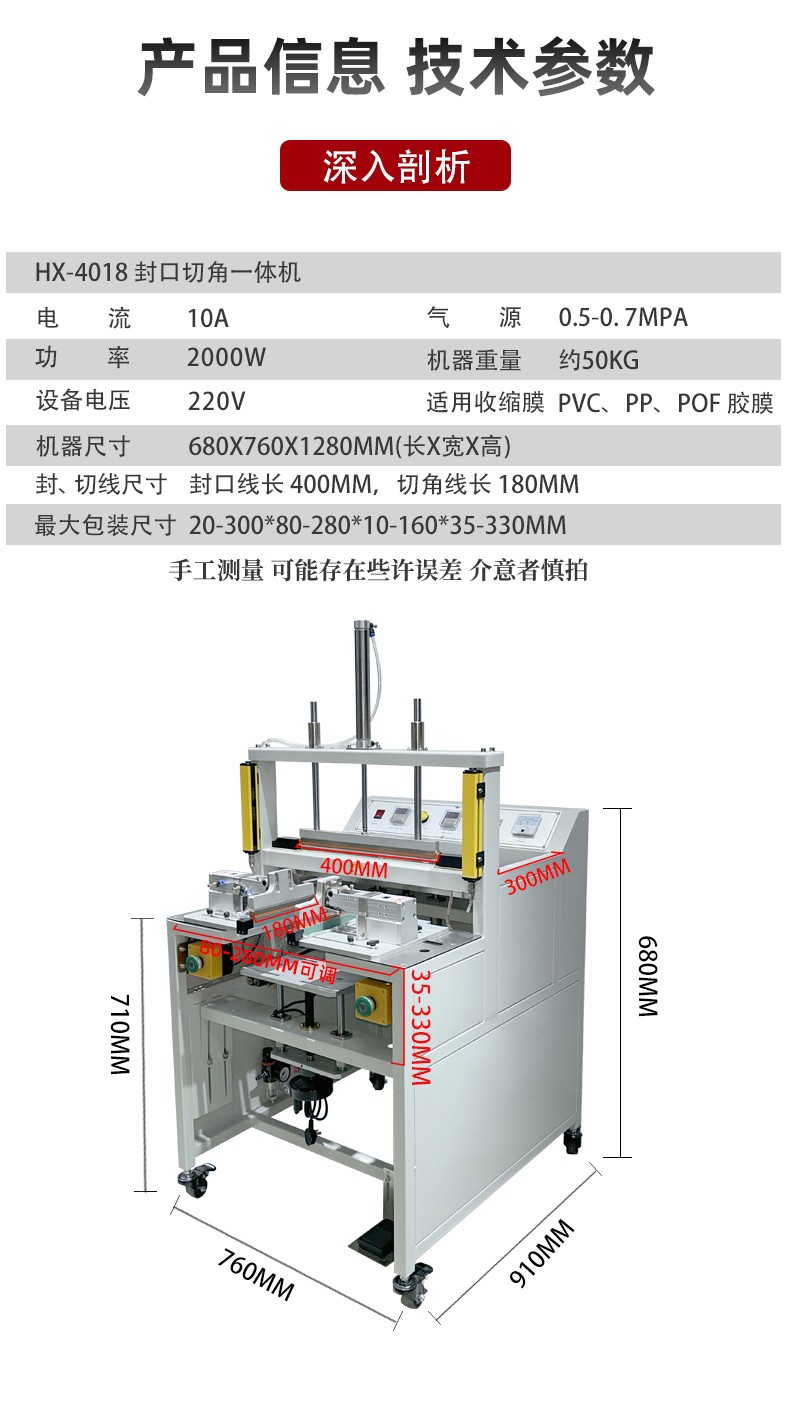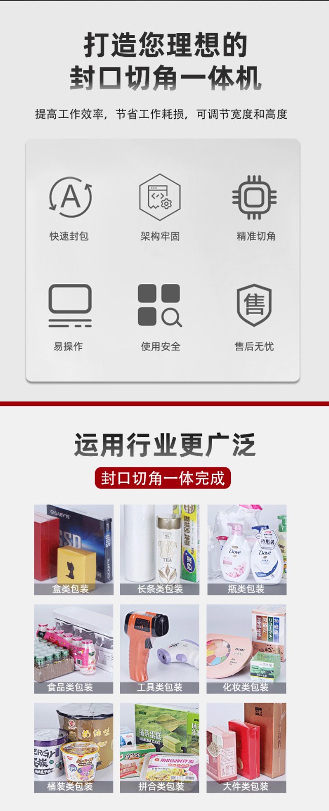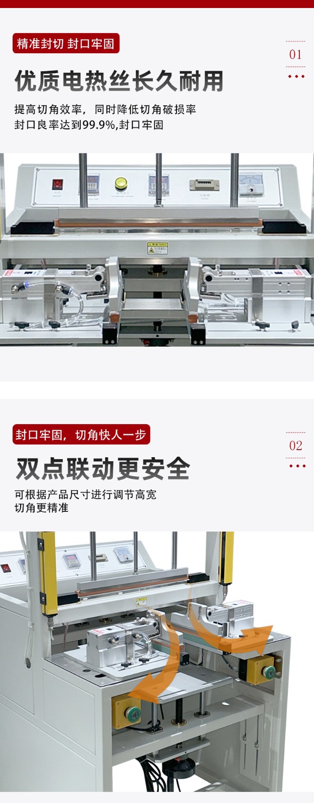 - 材料兼容性:食品药品包装通常会使用符合食品安全标准或药用包装标准的材料,如聚乙烯(PE)、聚丙烯(PP)、聚酯(PET)等塑料薄膜,以及铝箔复合膜等。封口切角一体机可以根据不同的包装材料特性,调整合适的封口参数,实现良好的封口效果,与各类食品药品包装材料具有较好的兼容性。
