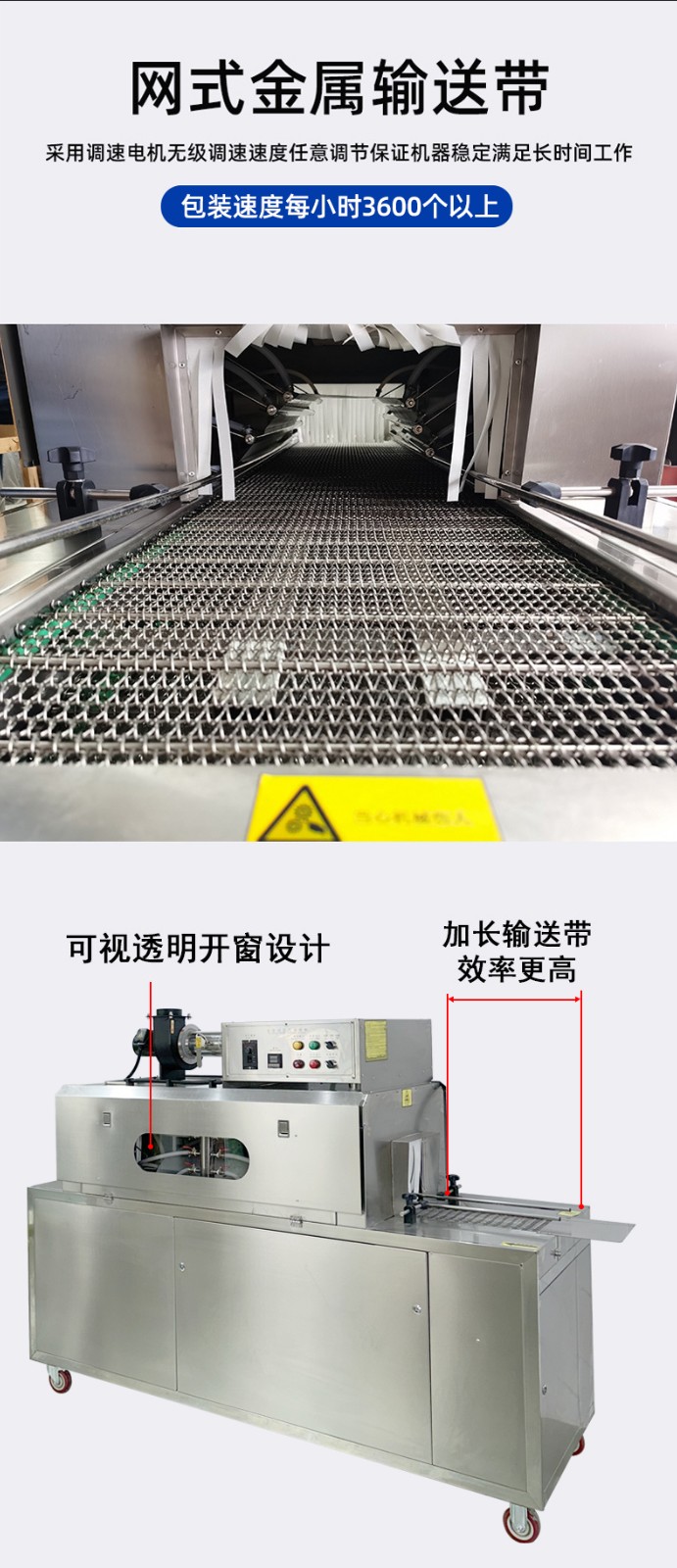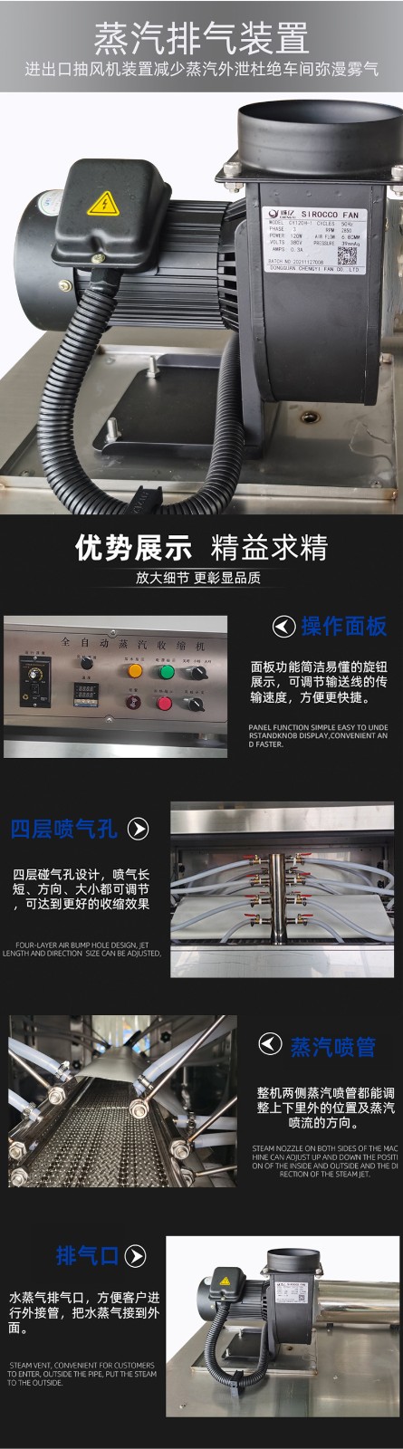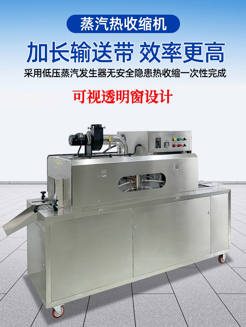 - 收缩效果均匀美观收缩室采用环形蒸汽喷射设计,蒸汽能 360° 无死角包裹产品表面,使热收缩膜受热均匀,收缩后紧密贴合产品轮廓,无褶皱、无气泡,即使是异形、棱角分明的产品(如五金工具、瓶装饮料),也能实现平整光滑的包装效果。